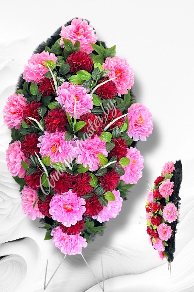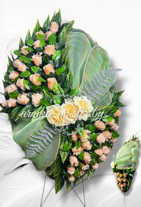 • Внушительные габариты: высота венка 110 см, ширина 65 см и высота ножек 25 см обеспечивают его заметность и торжественность. Общая высота 135 см делает его монументальным украшением места прощания.