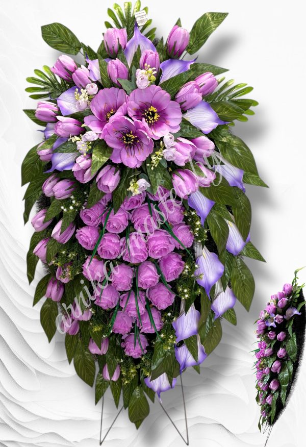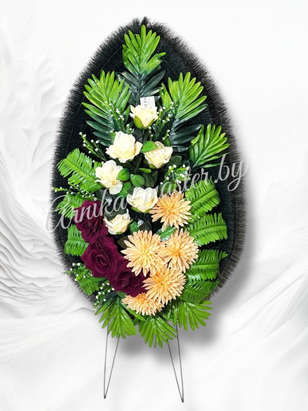 Каркас выполнен из прочной проволоки в нестандартной форме, что придает изделию особый облик. Фон каркаса оплетен ритуальной елкой, создавая гармоничную основу, подчеркивающую глубину композиции.