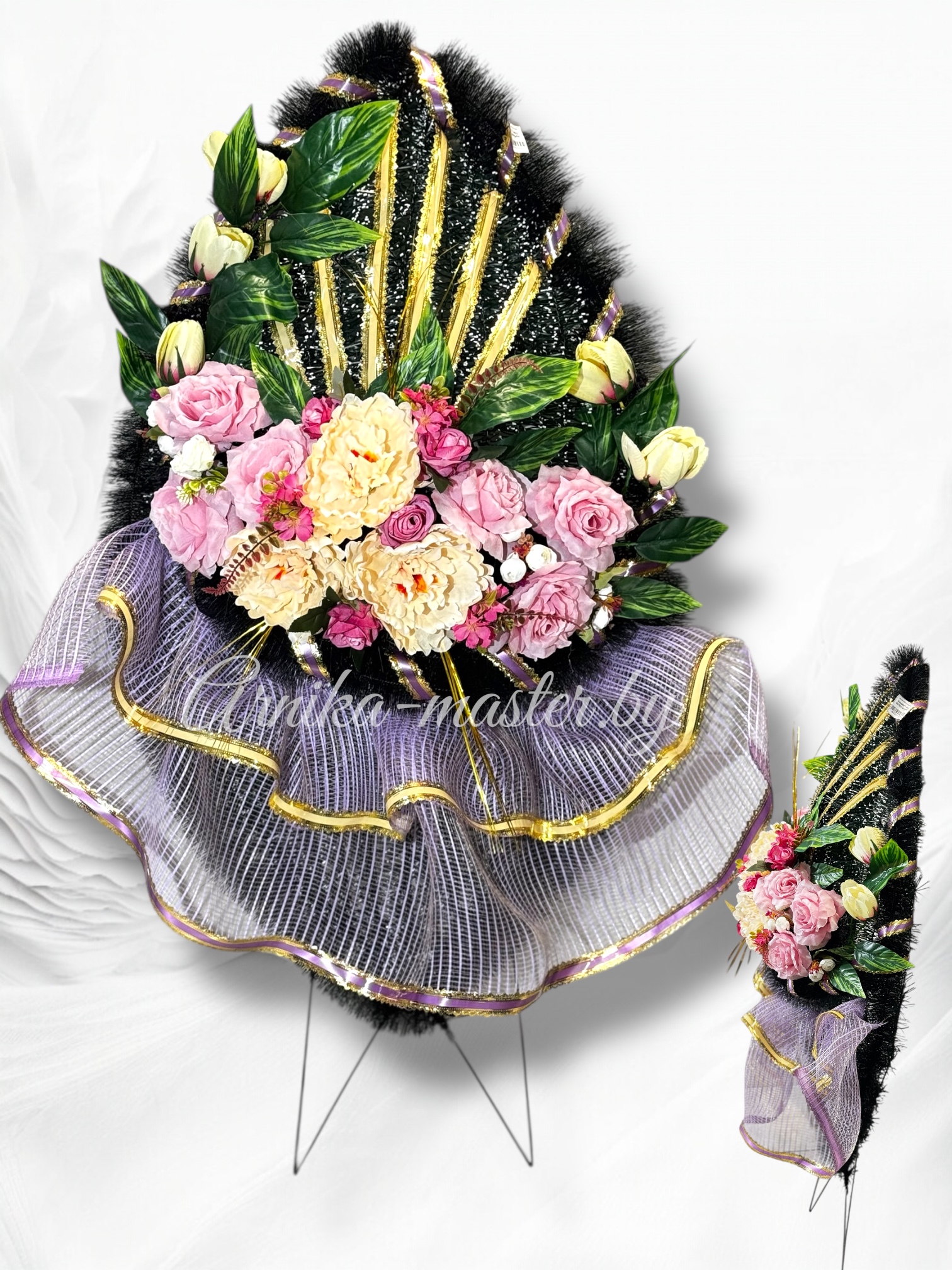 • Высота ножек: 25 см — элегантные ножки приподнимают венок, придавая ему устойчивость и подчёркивая его значимость, делая его заметным даже на большом расстоянии.