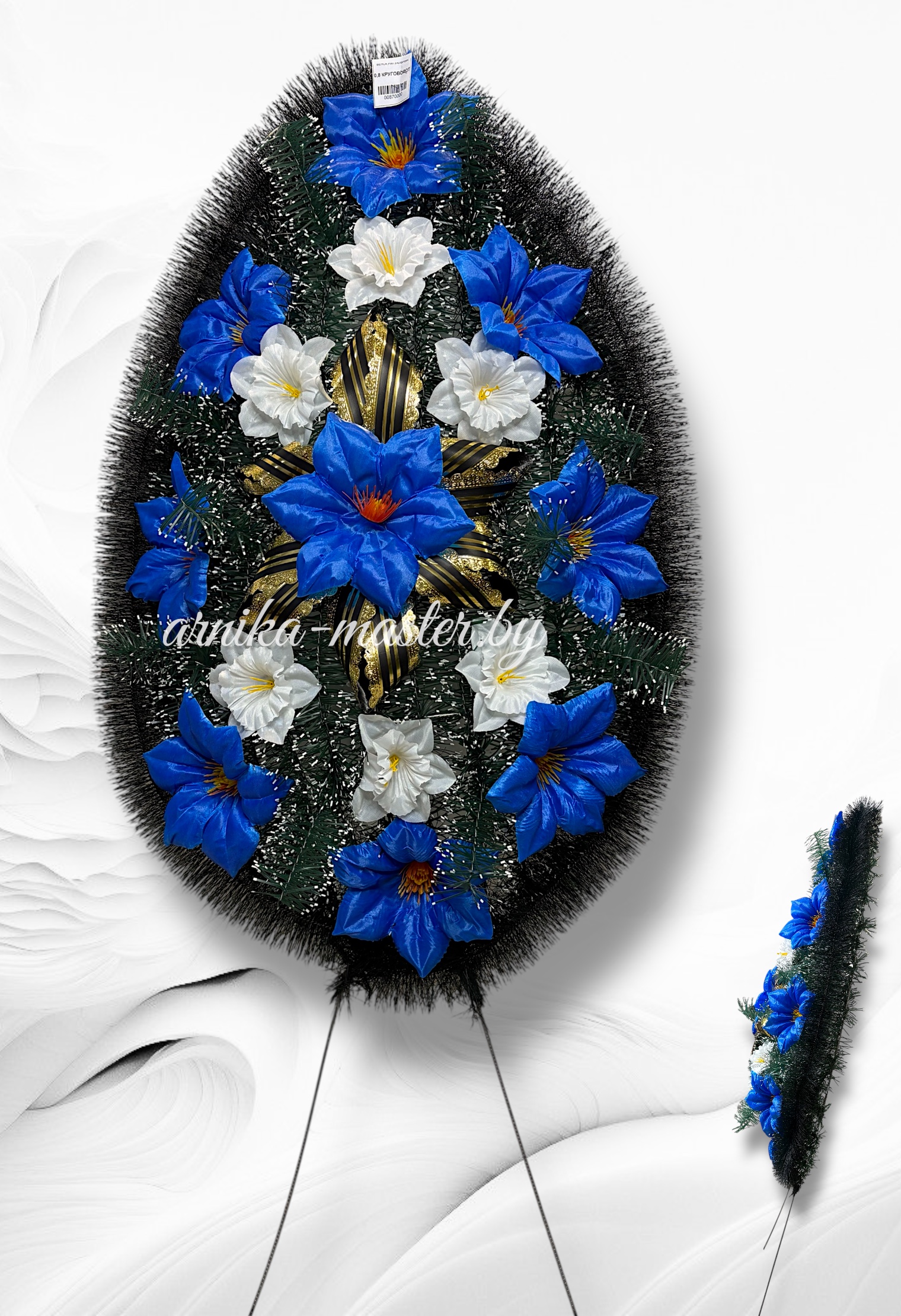 Купить венок траурный “Круговорот” возможно как оптом, так и в розницу. Высота венка с ногами 120 см, ширина 55 см. Высота ног ритуального венка составляет 40 см. Каркас отличается прочностью и надежностью. Этот венок является символом и знаком скорби. Вы можете также заказать на нашем сайте arnika-master.by оптом и в розницу не только траурный венок, но и ритуальные корзины, ритуальные лампады, ритуальные товары, ритуальные букеты и так далее. Мы будем рады помочь Вам в выборе нашей продукции. Подберём для Вас оптимальный комплект (венок траурный, траурная лампада, траурная корзина), чтобы Вы могли выразить свои чувства к усопшему. Вы можете прийти или приехать к нам в г.Витебск ул.Ревоюционная 33б. Там можно приобрести готовую продукцию на нашем складе. Такие как венок траурный, ритуальную корзину, ритуальную лампаду, ритуальные букеты, ритуальные товары, оптом или в розницу за наличный и безналичный расчет. Если купить венок у нас, лента с надиктованным Вами текстом в подарок.